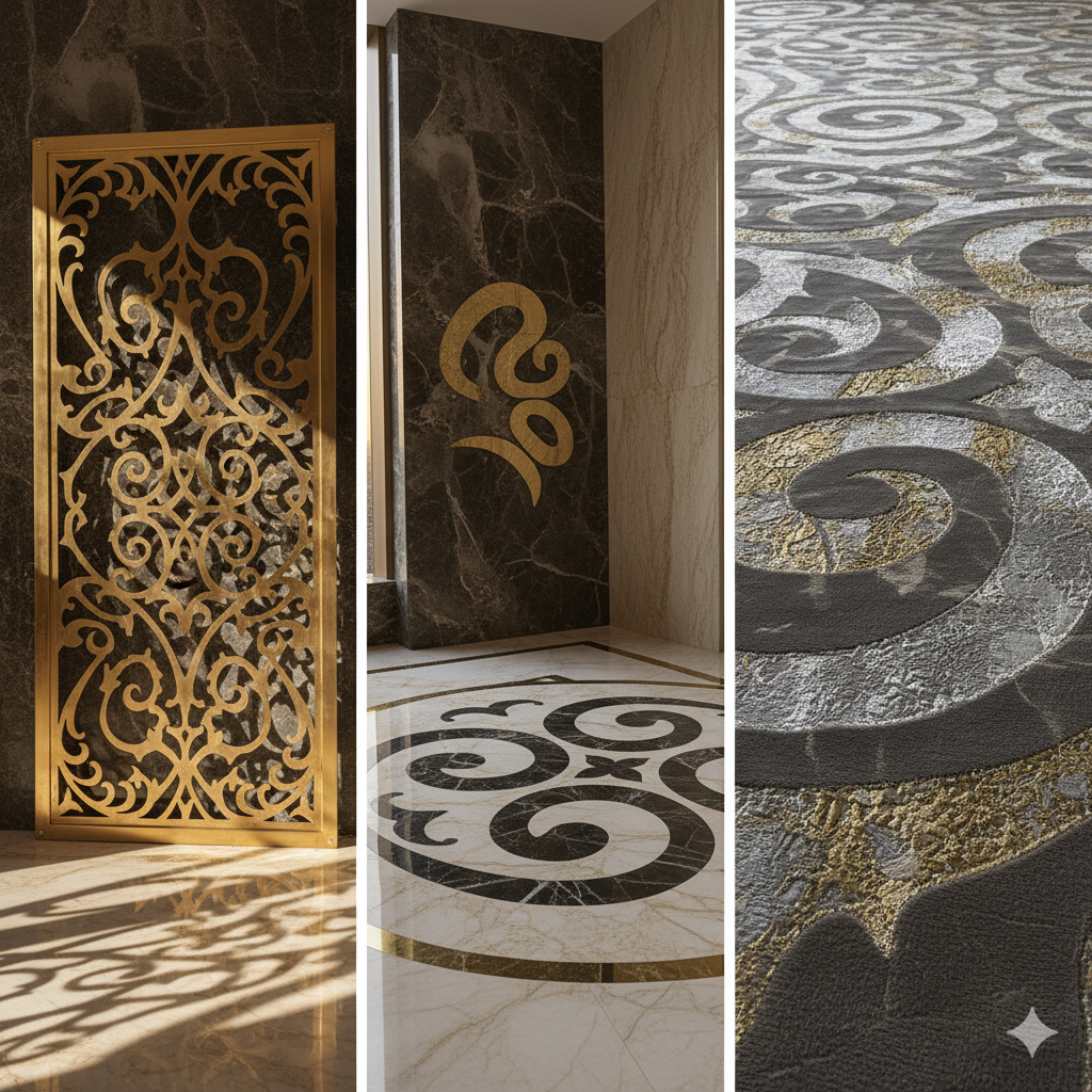 Использование мотива в каменной инкрустации, особенно в мозаиках из мрамора, оникса и гранита, поднимает традиционно мобильный, текстильный символ на уровень монументальности и вечности. Его можно увидеть в величественных медальонах на полу в лобби, в виде резного барельефа на акцентной стене или в сложных узорах, вырезанных гидроабразивной установкой, на стенах ванных комнат. Камень придает орнаменту ощущение геологического времени, истории и несокрушимой стабильности. Он превращает символ кочевой жизни в свидетельство наследия, которое строится на века, укореняя успех владельца в самой земле.