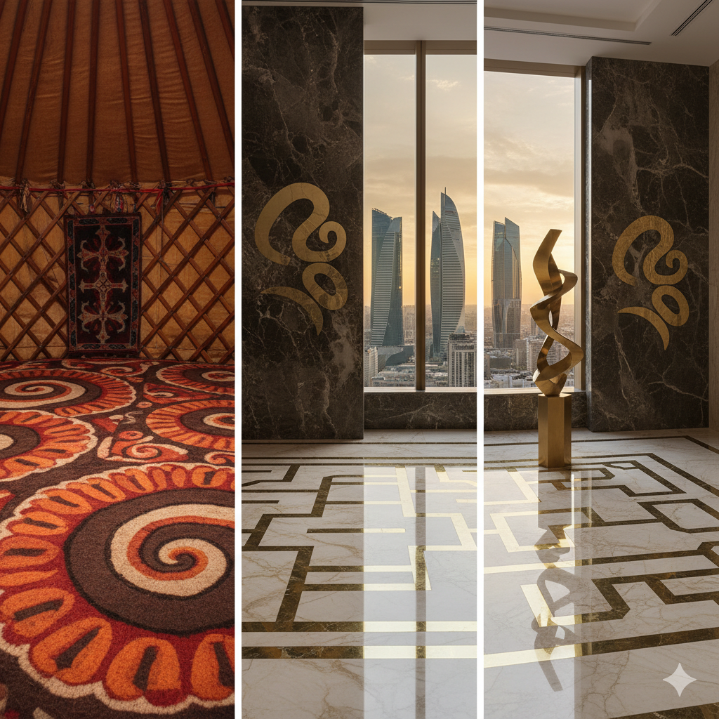Представьте себе теплую, круговую защищенность юрты, где на войлочном сырмаке закручиваются в спирали древние узоры. А теперь перенесите этот образ на вершину небоскреба с видом на футуристический горизонт Астаны, где тот же самый вековой завиток, отлитый из полированной латуни, мерцает в мраморном полу пентхауса. Этот контраст — не просто стилистический прием; это визуализация пути, который проделал один из самых значимых символов казахской культуры, орнамент «қошқар мүйіз» (бараний рог). Он прошел сквозь время, пространство и социальные статусы, доказав свою невероятную адаптивность.